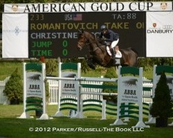 Christine McCrea and Romantovich Take One win The American Gold Cup Qualifier North Salem, NY-September 14, 2012 -Christine McCrea jumped ahead of the competition Friday to place first in the $50,000 American Gold Cup Qualifier at the picturesque Old Salem Farm in North Salem, NY. The day was clear and warm to welcome the 50 entrants to the final class of the day on the spectacular grass Grand Prix field. Six entries went clear and headed to the jump-off. McCrea had the winning time with 40.830 seconds aboard Romantovich Take One owned by Candy Tribble.
