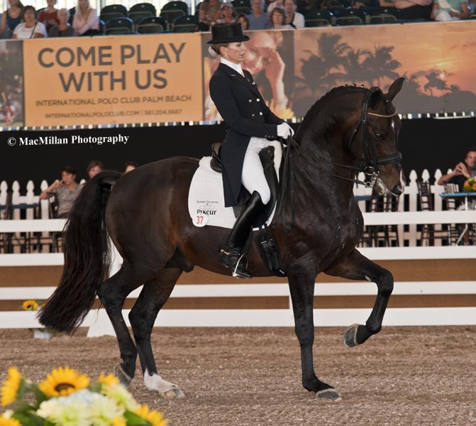 4- Lisa Wilcox and her and Horses Unlimited’s 10-year-old Hanoverian stallion Pikko del Cerro HU (by Pik-L) impressed the judges with a flowing test augmented by his showy gaits to win the $2,000 FEI Grand Prix Open CDI3* at the World Dressage Masters. Photo by Kim MacMillan