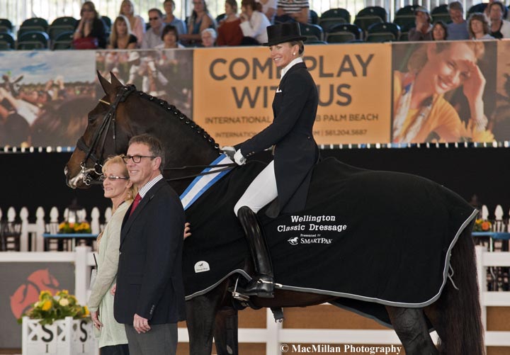 5- Lisa Wilcox riding the Hanoverian stallion Pikko del Cerro HU was all smiles celebrating their win in the $2,000 FEI Grand Prix Open CDI3* at the World Dressage Masters. Photo by Kim MacMillan