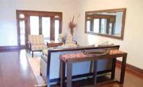 Brazil and all interior doors are mahogany stained and carved solid wood. Window dressings are custom made from Scalamandre