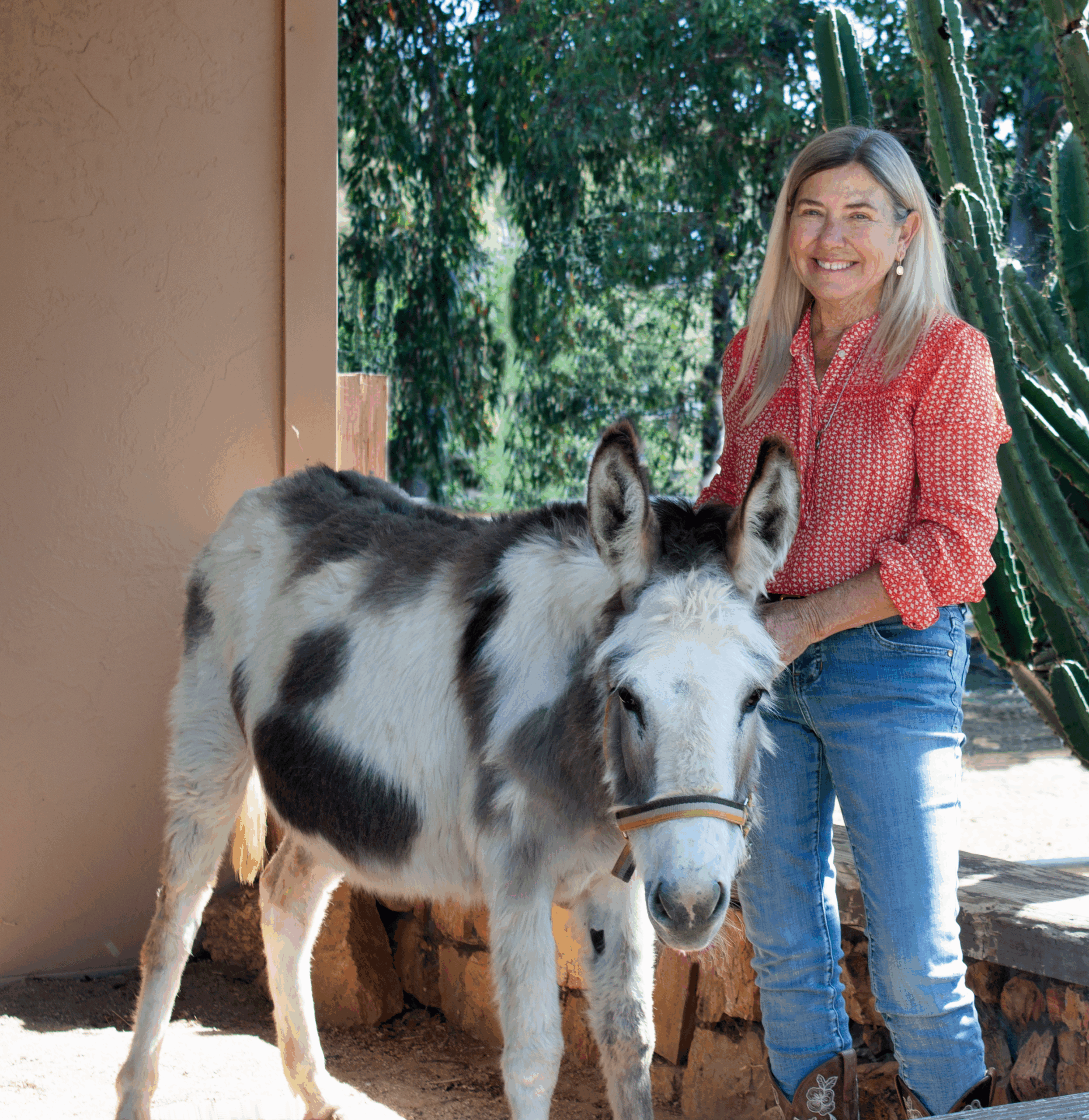 In early 2023, Donna’s painting of a mini donkey based on one she saw in a free-roaming herd near Bakersfield was shown at The Tiny Show at Pence Gallery in Davis, California. The name of the show stems from the 5×7-inch size of the panels sent to each artist. And Donna’s real life is now imitating art. This February Donna adopted Molly, a donkey, who now lives in the backyard with Gracie and Romeo. “Molly was intercepted by a rescue group as she was heading to a high-risk auction. She had some health issues, was emaciated, her teeth needed work and she seemed so fragile the first few days that I waited to post about her. She has recovered her health, her brays are getting longer and stronger and she has developed a distinctly sassy attitude.”