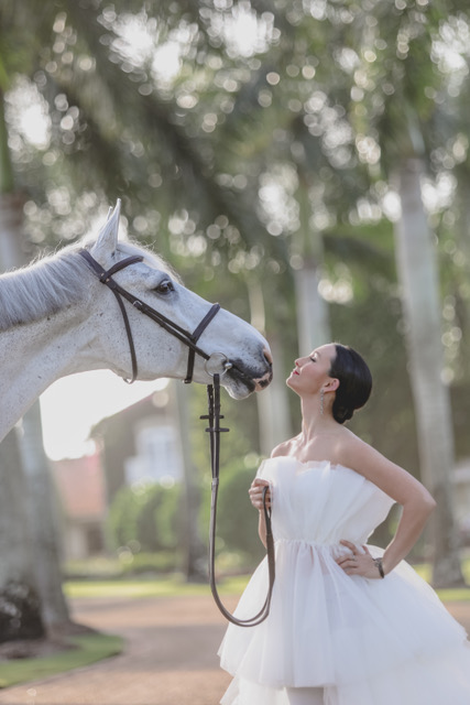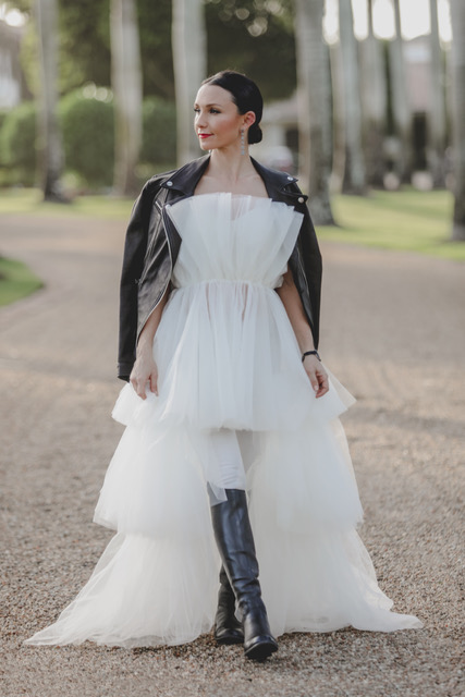 Georgina is wearing dresses from Ella-Rue (@shopellarue). The white gown is a Swanns Point Lily Tulle Dress and the red gown an Alexis Laurel lace gown. Georgina is wearing shirts by Nouvelle Palm Beach (@nouvellepalmbeach). Leather pants, leather jacket and jewelry by Fab Finds by Sarah (@fabfindsbysarah). Riding jacket by Amino, boots by Der Dau and breeches by Ariat. Wardrobe styling by Alexa Johnson and Shawna Simmons. Photo assistant Madeline Gammill. Hair and makeup by Gina Simone, instagram.com/gsbeaute