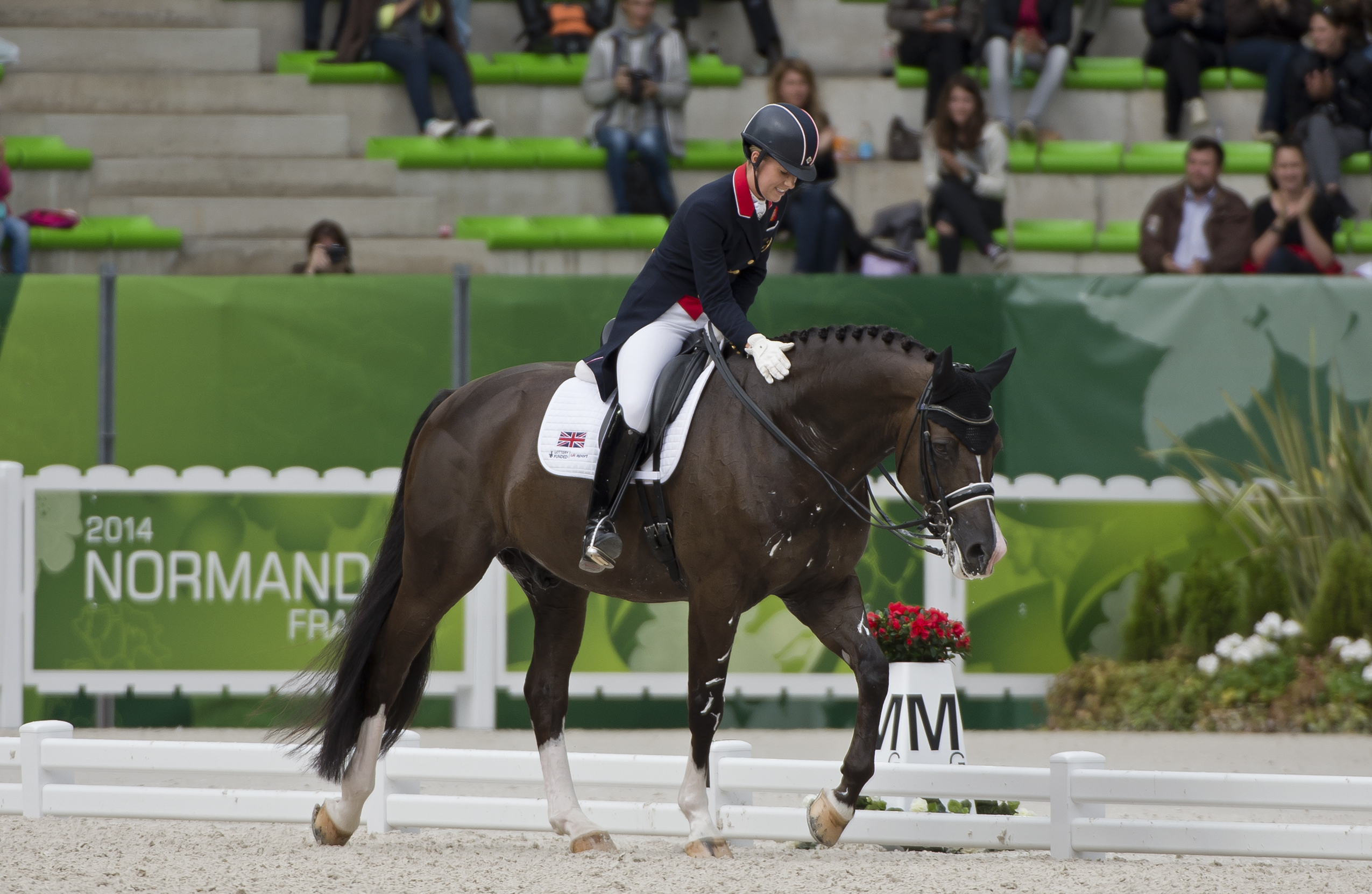 Among the first FEI dressage riders to wear a helmet full time, Charlotte is extra careful after being injured in 2009. “I actually fractured my skull through not wearing a hat,” she said. “I was so lucky to escape from that and now it’s something I always do. I feel unsafe without my hat on. People say you don’t always need it but for me, especially in this kind of atmosphere, you never know what can happen.”