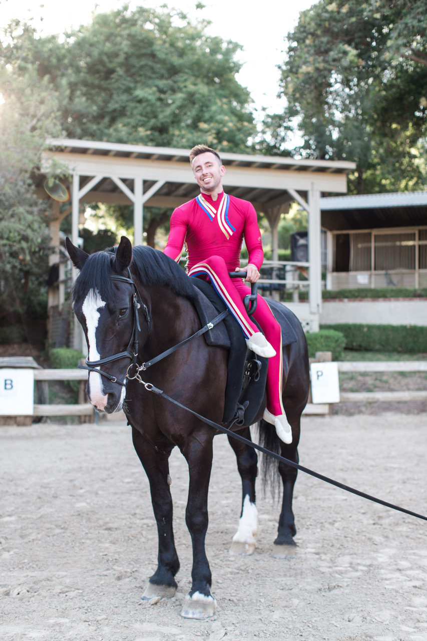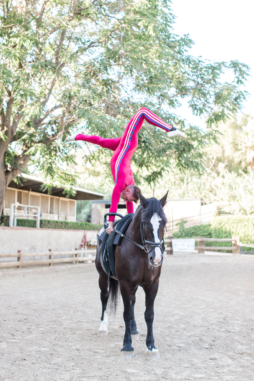 At Shadow Hills, he teaches primarily with a black mare named Gigi, on loan from the Orange County Vaulting Club. “She’s a classic mare,” Geoffrey said. “She’s very particular and our relationship is one of give and take. Gigi has been a great addition to our program.”