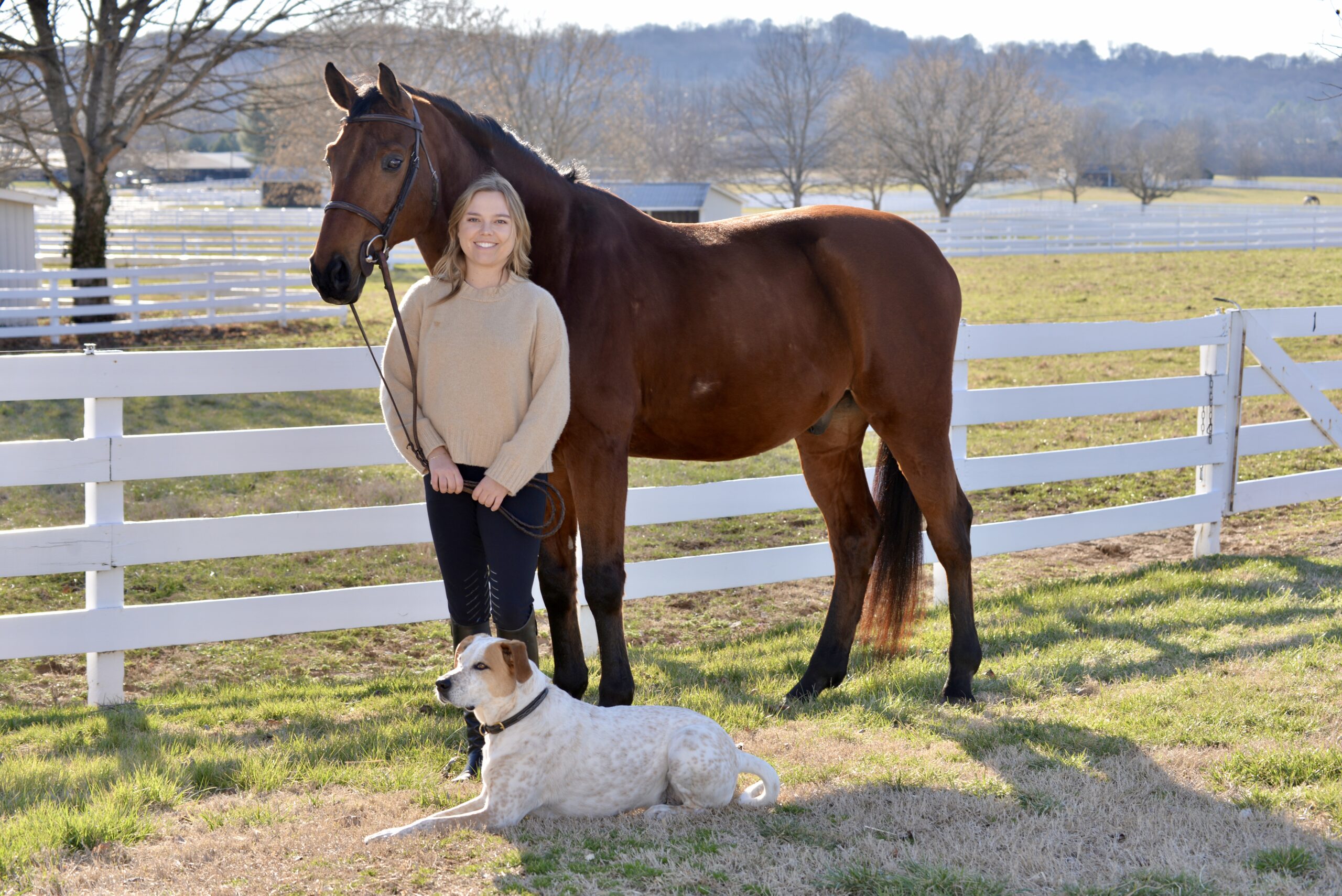 Martha Ingram with her horse Airport 48, who is now retired, and her dog Rhett in Franklin, Tennessee.