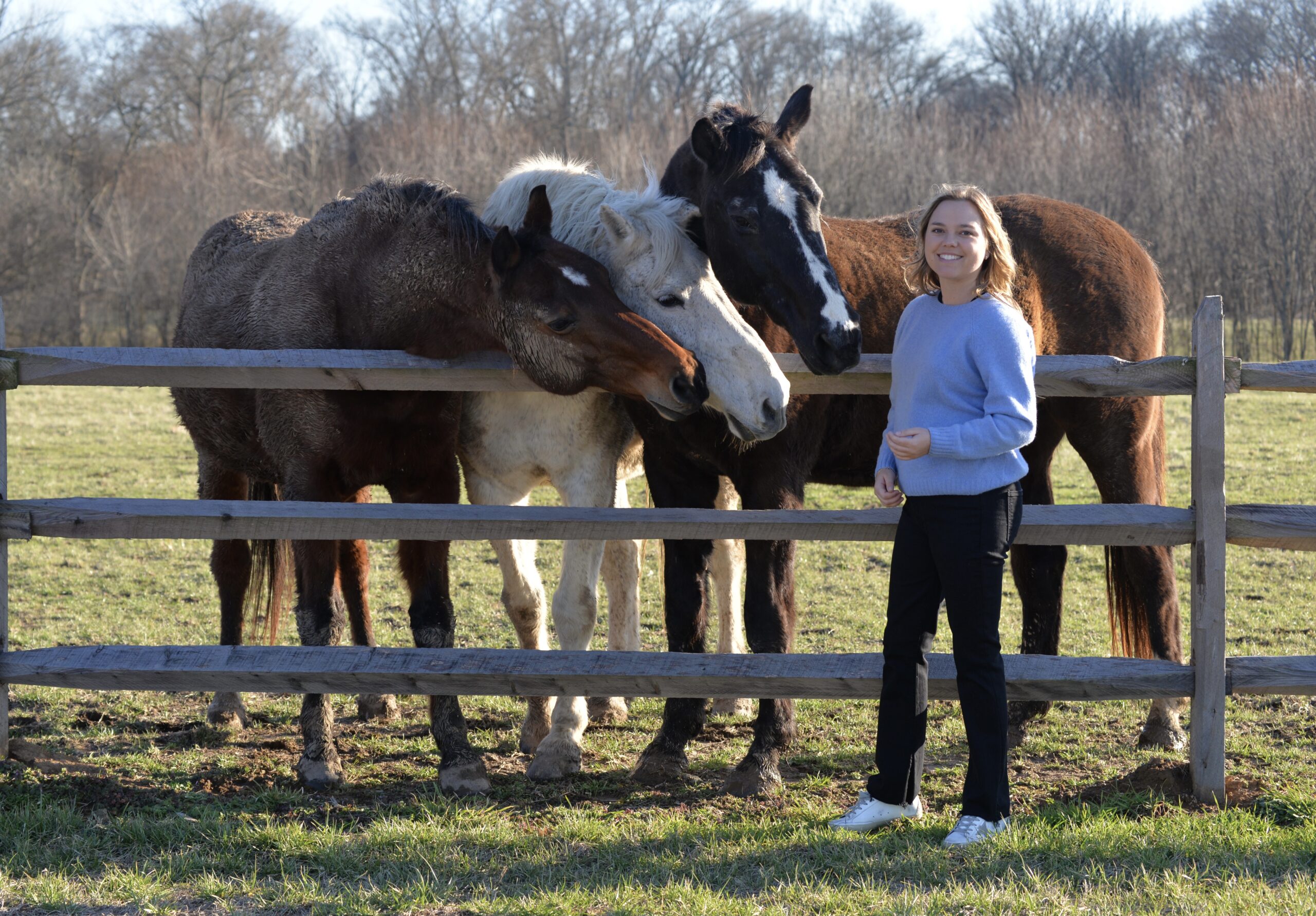 Martha enjoys a visit with retired horses, from the left, Lyons Creek Bellini, Absolut and Tenacious.