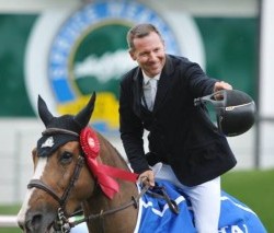 (SPRUCE MEADOWS, Calgary, AB): A record crowd of over 13,000 fans came out to celebrate Canada Day at Spruce Meadows, while cheering on their favourite athletes during the 2012 Spruce Meadows ‘Canada One’ Tournament. Eric Lamaze & Coriana Van Klapscheut, winners of the West Canadian Cup. (Photo by Spruce Meadows Media Services) Canada Day competition started off with the 1.50 meter West Canadian Cup, with 34 horse/rider combinations on the playing field. As predicted, Anthony D’Ambrosio (USA) created a tough track for the riders, stretching over 555 meters with 16 jumping obstacles. Four combinations moved on into the jump off, with only one Canadian among them